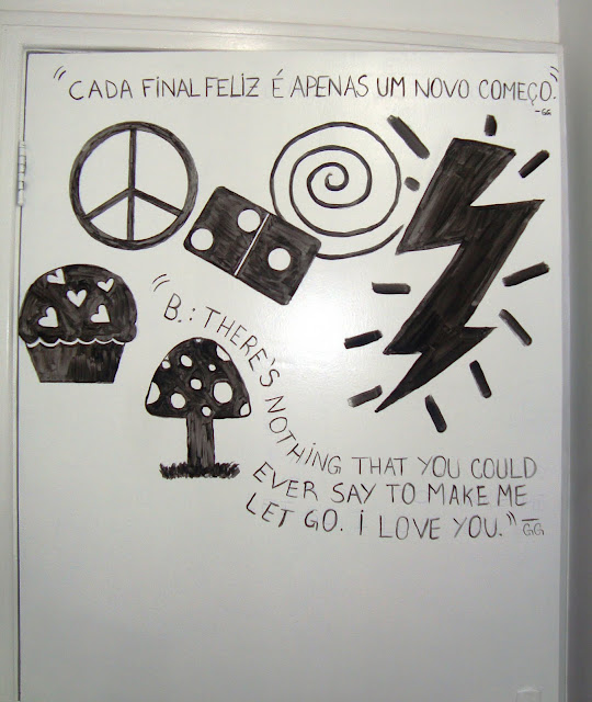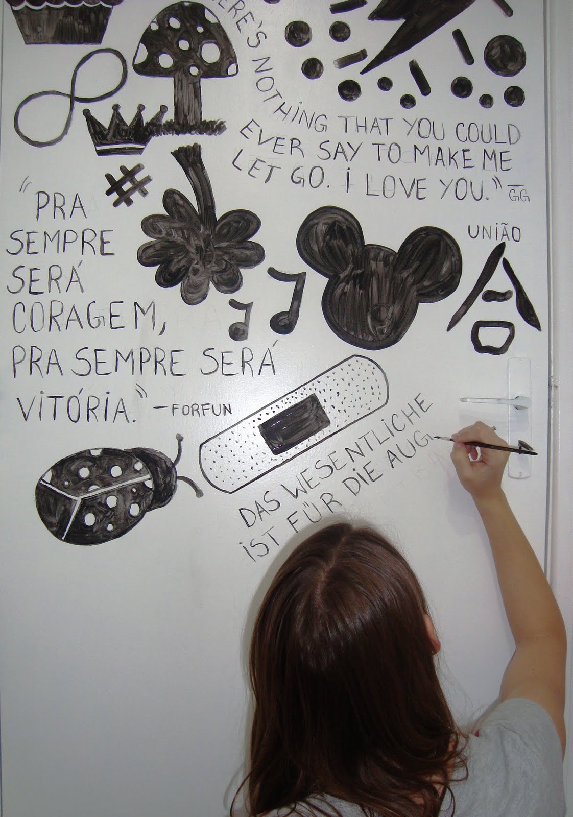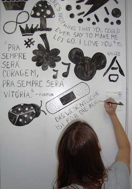 Cheguei em casa hoje e encontrei a decoração da porta do quarto da Kerstin em andamento… deu vontade e ela começou a pintar, do jeito dela, do gosto dela, criações de adolescente. Achei o máximo!