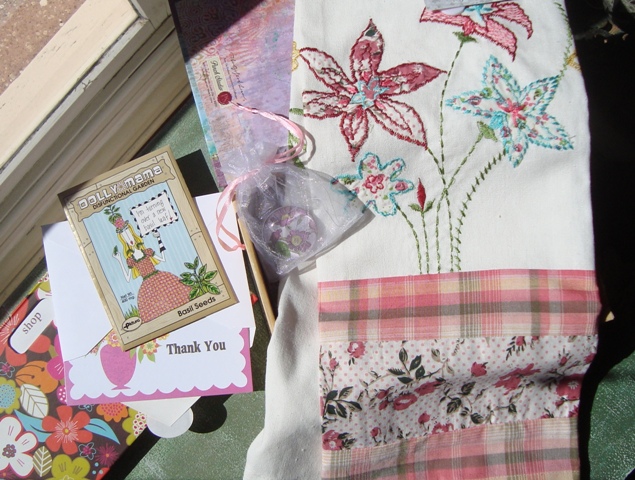… recheada de coisas fofas, que quase não couberam na foto! Um pano de prato com aplicações liiiindas, um imã fofíssimo, um bloco triplo de anotações pra me ajudar na minha rotina, sementes de manjericão, um cartão fofíssimo.