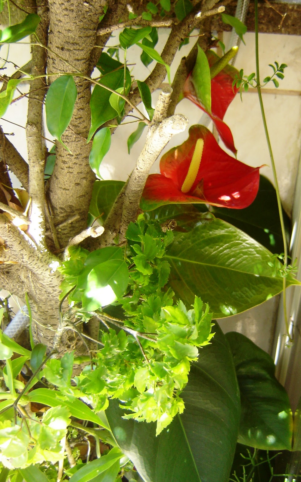 Continuando o assunto do post anterior… Ontem, quando cheguei, precisava organizar várias coisas, fazer mercado, etc… e nem vi direito os antúrios, escondidinhos atrás do ficus – e com várias flores, grandes e viçosas!