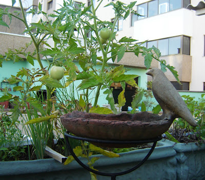 Fim de férias – foram ótimas, excelentes! Mas também é bom voltar para casa depois de mais de um mês fora. E vejam o que encontrei: tomates na floreira! E quando saí, não dava nem pra saber se realmente eram tomateiros que tinham brotado!