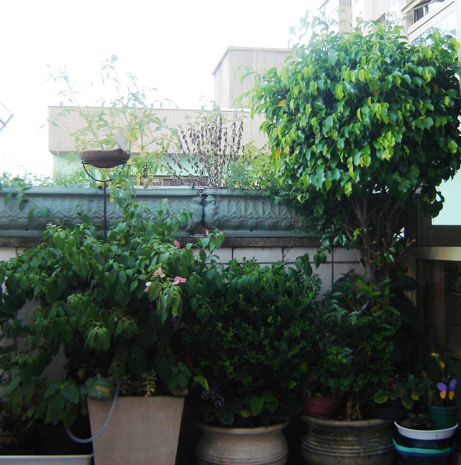 Como eu ficaria um mês fora de casa e precisaria garantir água para as plantas do meu terraço (pessoas que poderiam molhar também estavam viajando!) confeccionei, eu mesma, uma irrigação caseira. Instalei uma mangueira entremeando-a nas floreiras e vasos, fiz vários furos e deixei gotejando (tipo gotejo de soro!). Arrisquei e deu certo – só a hortelã secou um pouco, pois a gota sobre ela parou!