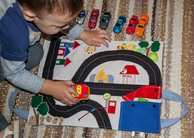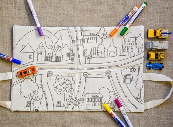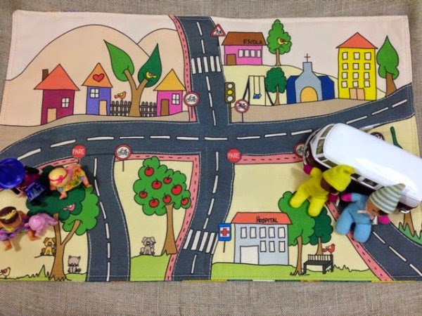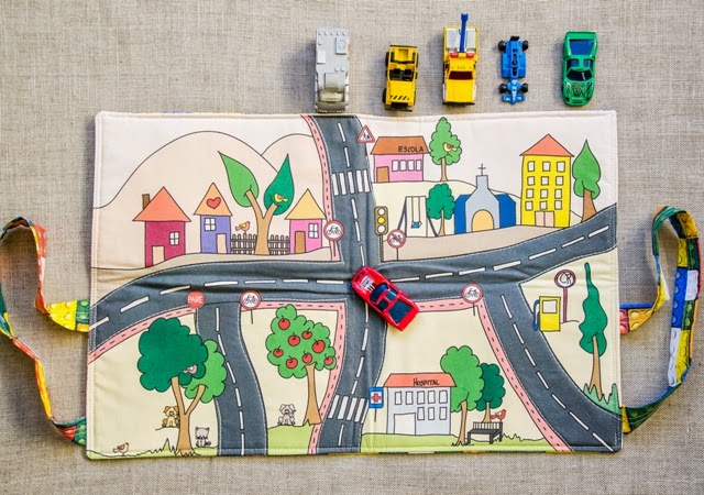 É um pequeno tapete – que fechado se transforma em uma bolsinha (por isso tem as alças na lateral) – com estradinha, sinais de trânsito, alguns elementos que se tem na cidade. Foi pensado como contributivo para o conhecimento do meio em que a criança vive – e a ideia é meninos e meninas brincarem com bonequinhos e carrinhos.