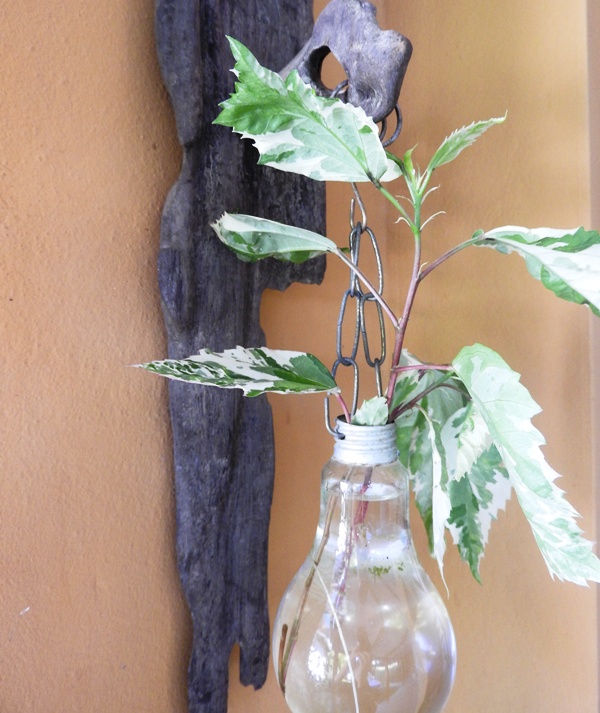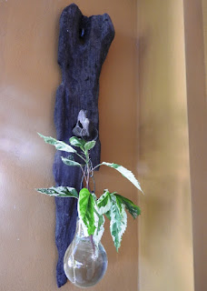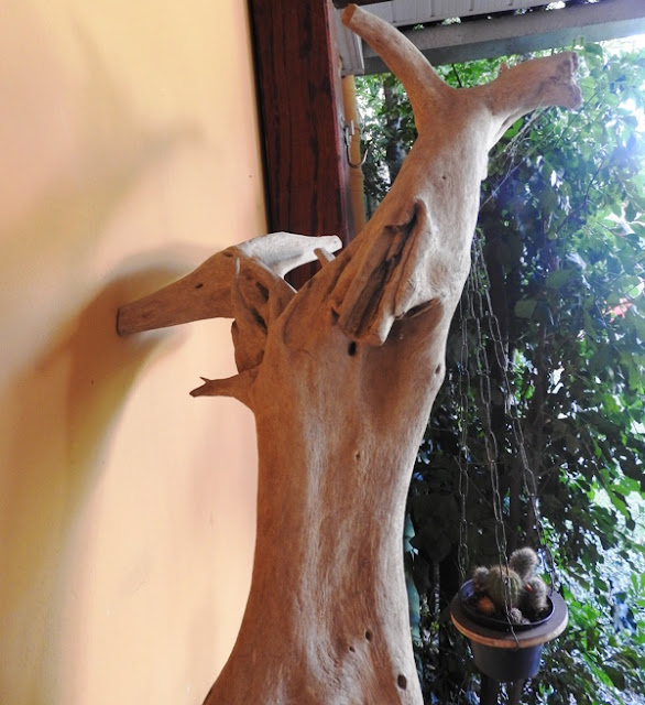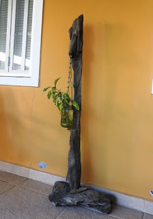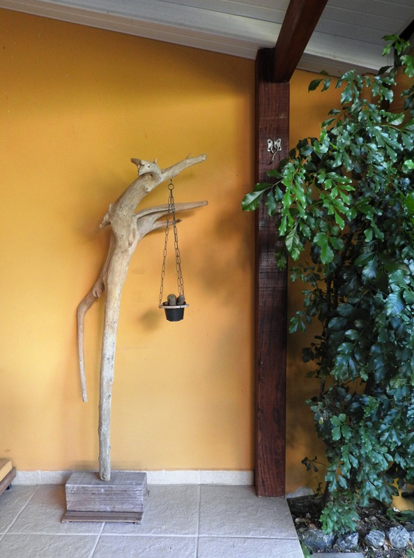 E tem as artes dele, feitas com restos da natureza (troncos encontrados na beira da praia) e reaproveitamento: