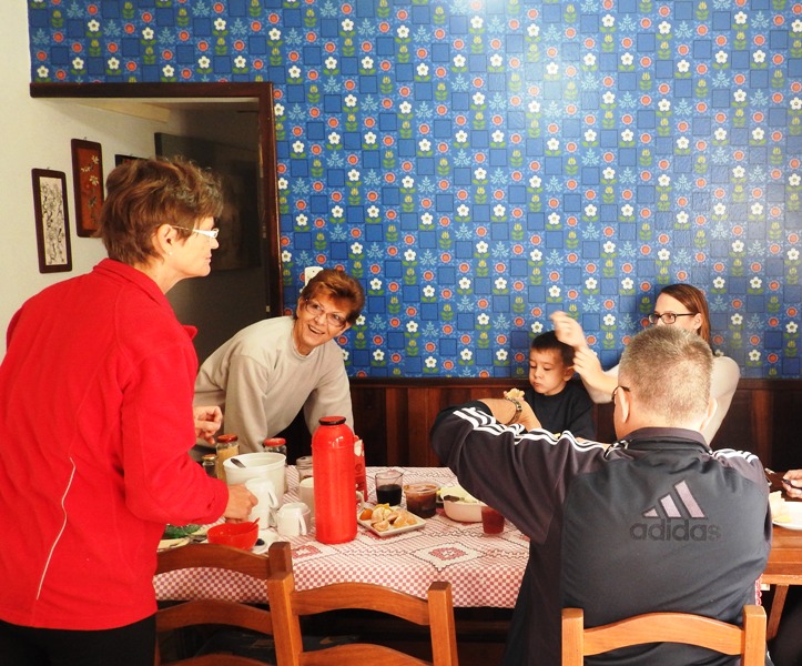 E tem marcas daqueles tempos: o papel de parede e a mesa de canto, por exemplo, são originais.[hora do café, antes de pegar a estrada!]