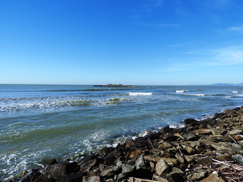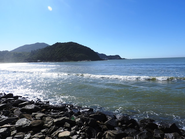 E a praia, hoje tem pouca área de areia, especialmente nesse dia de maré alta… mas os encantos do mar azul, da ilha de pedras, do costão, são os mesmos!!!