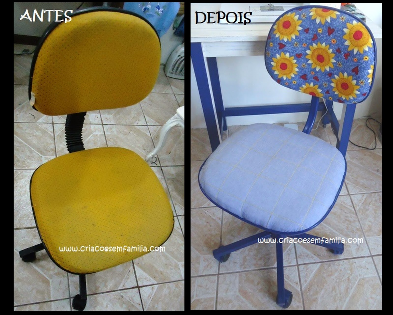 Duas cadeiras de escritório entraram na lista de transformações para ficarem com jeito de atelier.