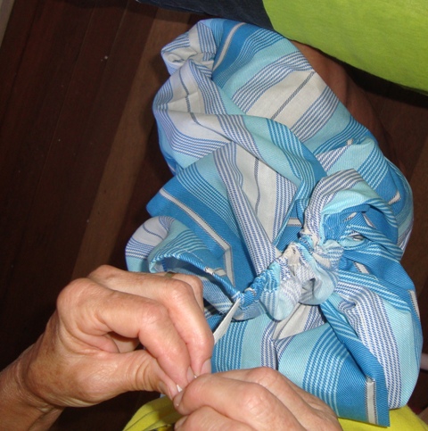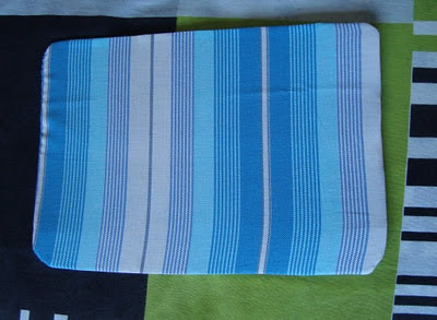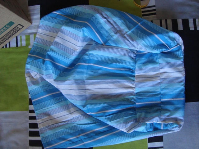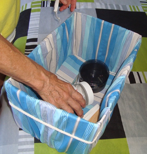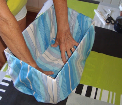 2) Faça um “saco”, cujo fundo tenha as medidas do fundo da caixa e o restante pode ser feito mais largo, para dar o efeito “fofinho” (minha mãe usou um sobra de tecido de lençol, mas vai ficar bem legal com chita, por exemplo!)
