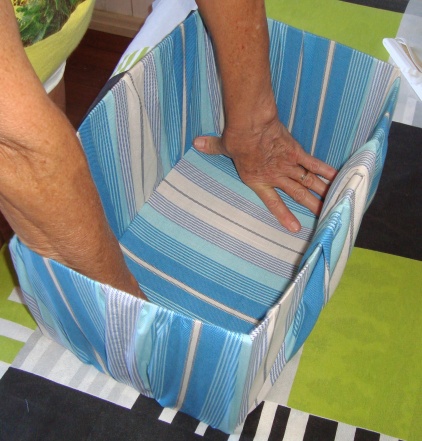 Pois bem, essa semana ela aproveitou uma caixa de papelão para organizar suas coisas de costura por aqui. Vejam como ficou – achei que ficou parecendo um cesto forrado! A vantagem de fazer desse jeito, sem cola é que se a caixa estragar, dá pra trocar; se o tecido sujar, dá pra lavar…