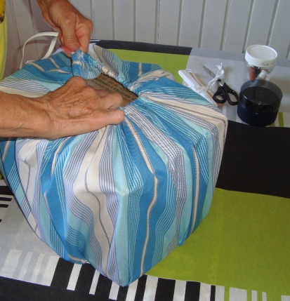3) Na outra ponta do “saco” faça uma bainha e passe um elástico, que será ajustado na parte inferior da caixa.