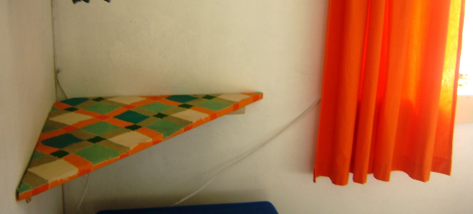 Precisava espaço para a TV ou para apoiar frasqueiras num dos quartos. Minha mãe, na rapidez e praticidade dela, pediu pro meu pai recortar umas tábuas, que ela “encapou” com um tecido estampado – é claro, combinando com as cortinas cor de laranja que ela costurou e já estavam ali também,alegrando o ambiente!