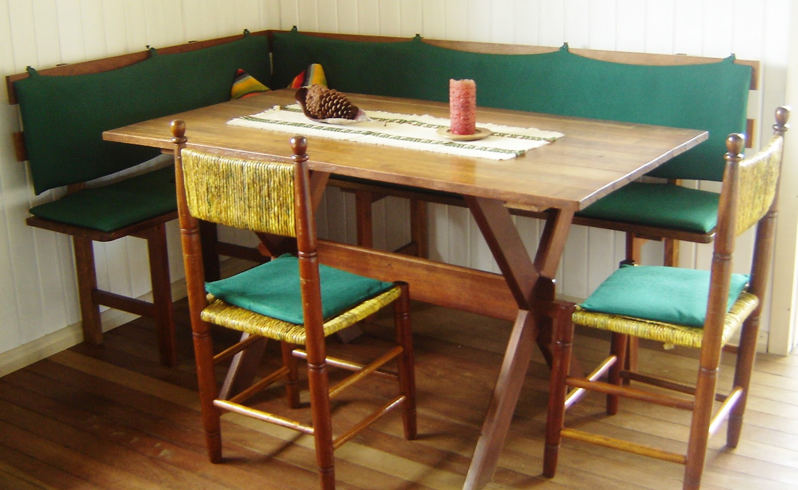 A mesa e o banco feitos pelo meu pai. As almofadas, pela minha mãe.