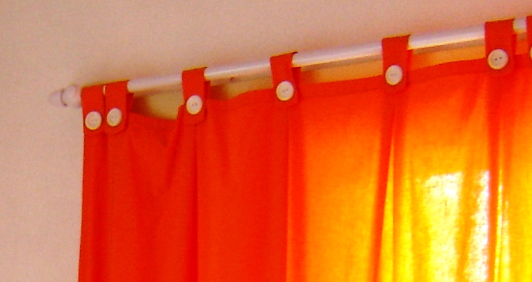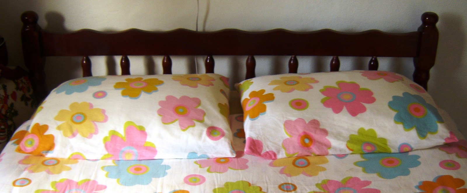 Ah! E para garantir que laranja (da cortina) e rosa pink (do ventilador) combinem, nada melhor do que as coloridas roupas de cama costuradas pela minha mãe também…