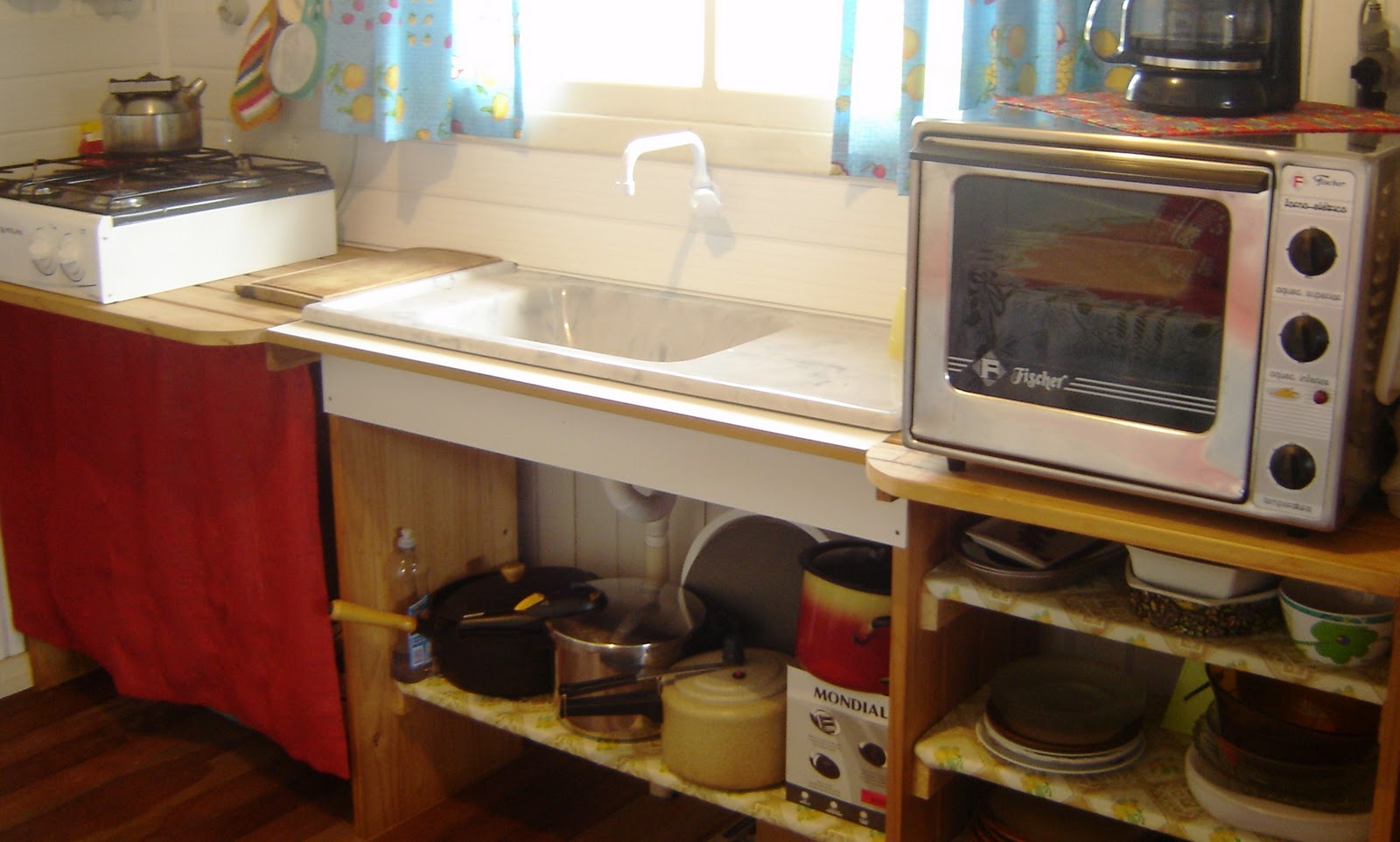 Era pra ser tudo simples e com pouco $. E usando da criatividade e imaginação. Assim, num sábado, após medir, calcular e comprar algumas pecinhas – ademais utilizou-se sobras da construção – saiu o balcão da pia e as estantes da cozinha, feitos pelo meu pai (marcenaria é atividade de lazer) e ajuda de meu cunhado.