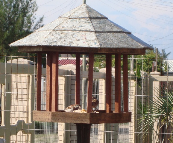 É muito bonito, mesmo, esse comedouro. Foi feito por uma pessoa no interior de São Paulo (link da época aqui – mas parece que não trabalha mais com o produto) – é de madeira e o telhado de materiais recicláveis. A fachada da casa, que já era alegre, ganhou ainda mais vida! Valeu o empenho, Alexandre!