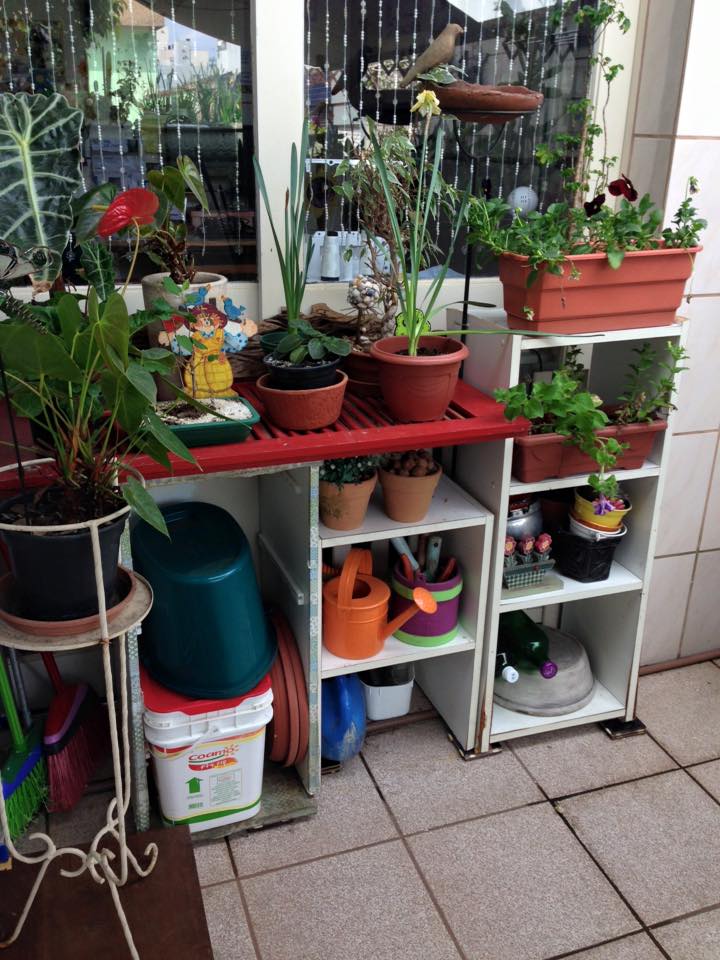 Eu não consegui carregar, quando achei alguém pra levar, o “papa-entulho” na rua tinha sumido. E eis que resolvi dar um último suspiro para eles, organizando um cantinho de flores e apetrechos de jardinagem.