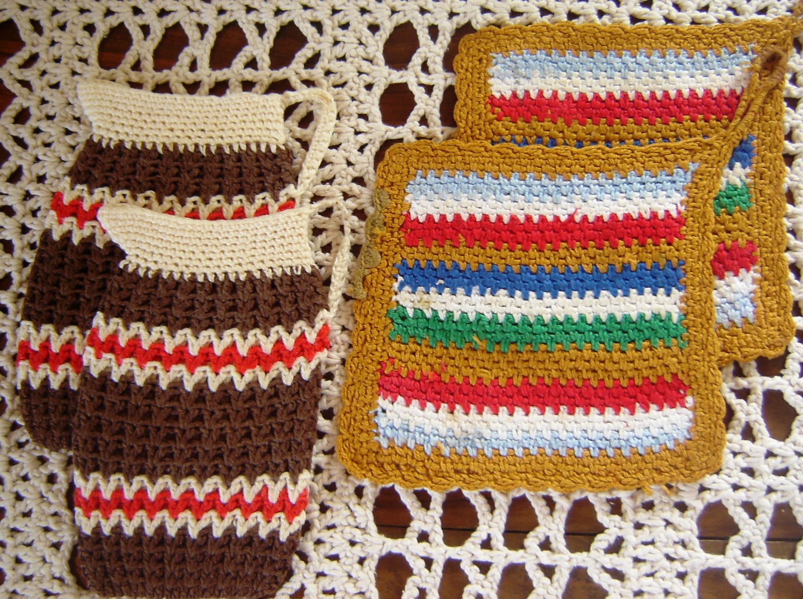 Uma, são os pegadores de panela de crochê feitos pela Vozinha (avó materna). Esses devem ter uns 25 anos (dá prá ver pelo uso!), pelo menos. Todas nós (filhas e netas dela) temos pegadores de panela feitos por ela. Desde novinhas ganhávamos de presente para “fazer parte do enxoval”!