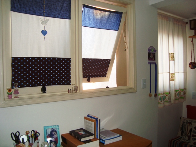 Quem lembra das brise-brise da cozinha? Pois é, depois de uma pausa, elas acharam um novo lugar! Agora foi a vez das janelas do gabinete. Essa é uma peça da casa que ainda está um tanto “confusa”, sem identidade própria – é depósito de caixas da mudança, rouparia, gabinete, quarto de hóspedes… Então, resolvi começar pelas janelas. Optei por uma composição com azul, com tecidos que eu tinha em casa, pensando em continuar seu uso em outras peças…