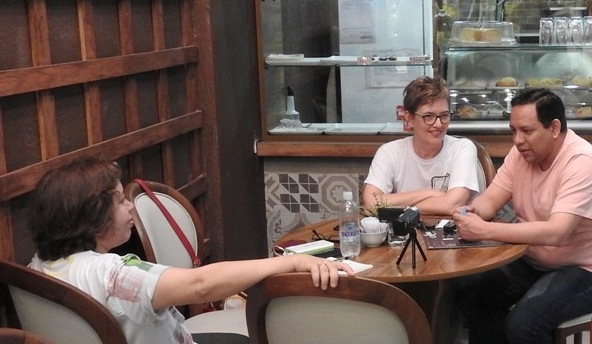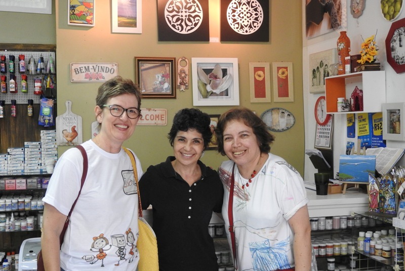 - Saindo dali, corremos para pegar a Arte Melo aberta… As gurias, no dia anterior, nos deram a dica. Sandra estava procurando tintas diferentes para experimentar no atelier… e elas sugeriram tintas True Colors. Só depois é que “liguei” as coisas – e poderíamos ter marcado para encontrar Tays Rocha ali!!! Mas conhecer a Cinira e sua história, foi fantástico…!