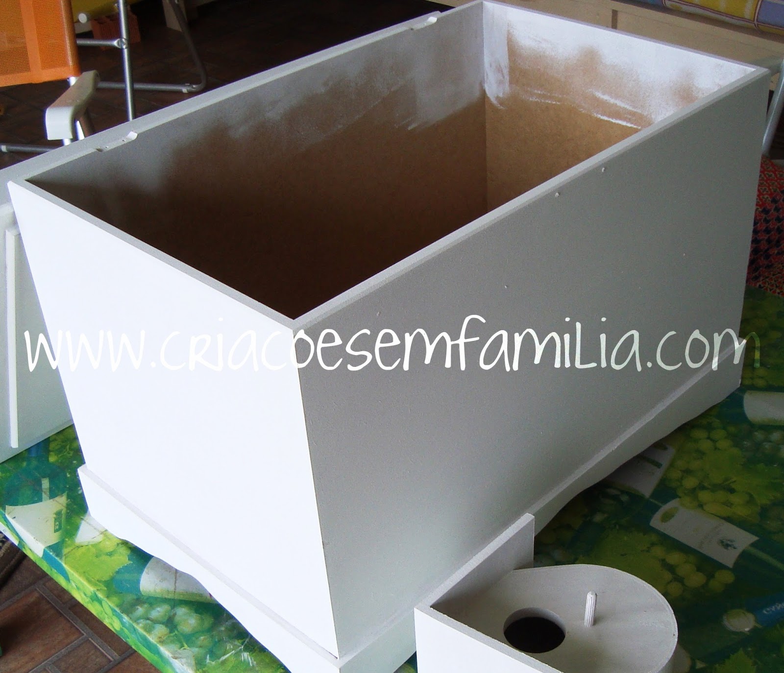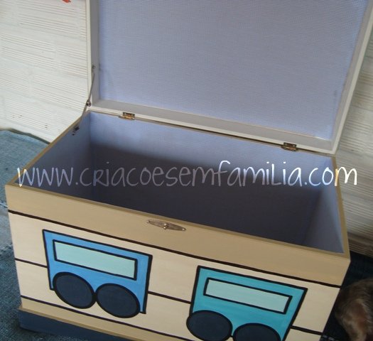 Na praia, além de descansar muito, divertir-se com a família, comer bem, caminhar bastante na beira da praia… também sobram algumas horinhas para criações. Essa semana foi a vez de fazer um baú para guardar brinquedos, para o meu pequeno afilhado. A irmã dele também ganhou um, como mostrei aqui.