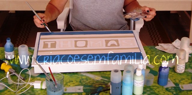 Por dentro forrei com tecido. O desenho copiei dos trabalhos que minha irmã Liliana fez para a cama do Thomas, que mostrei aqui.