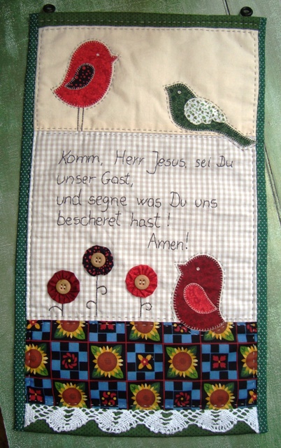 O bordado é a mesma oração que escrevi na parede de nossa cozinha