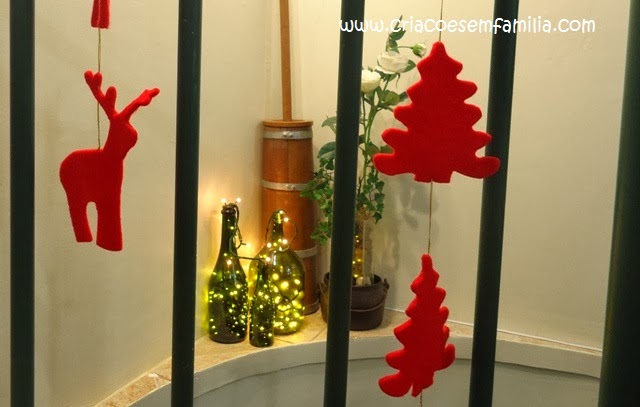 Cantinho da escada – feltros, garrafas e luzinhas.