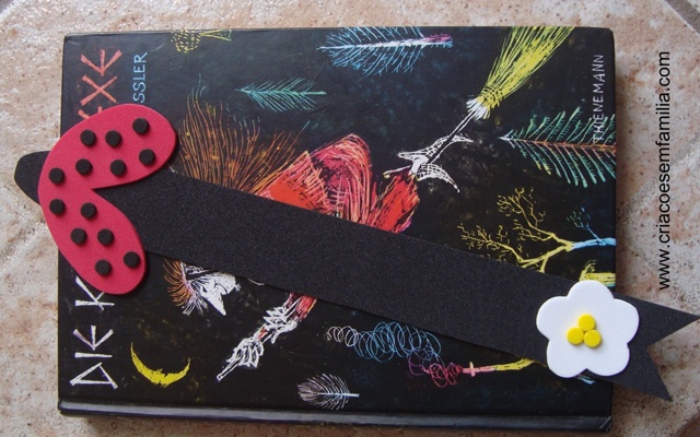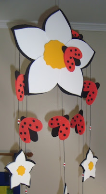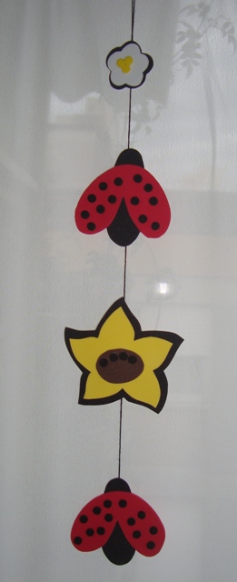 Lembrei de um molde enquanto organizava a Galeria de Criações Compartilhadas n° 4: joaninhas e ciaque encontrei no livro Das große Buch der Fensterbilder: Die schönsten Ideen rund ums Jahr. No livro é feito de papel, mas eu o adaptei para EVA, há alguns anos, quando fiz este o móbile de joaninhas com as flores brancas (abaixo).