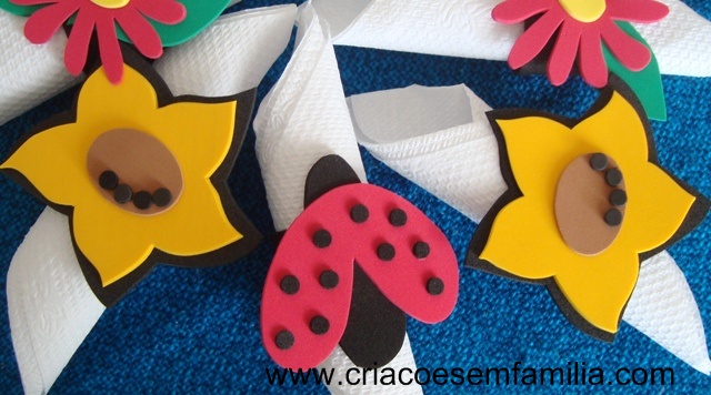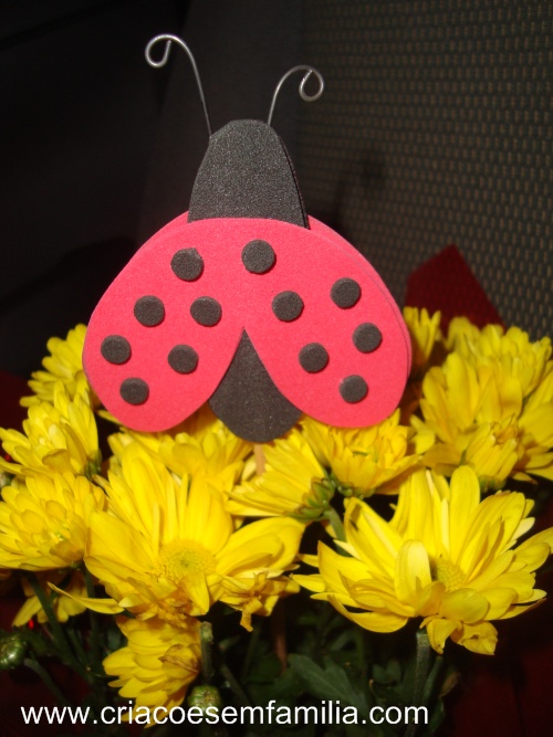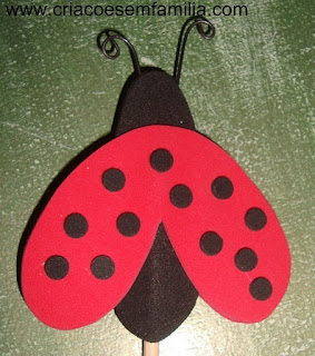 Material: EVA vermelho e preto – dá pra fazer 15 joaninhas com aqueles pedaços de EVA vendidos no tamanho A4 (210 X 297mm); e o genérico para artesanato: tesoura, cola, lápis…e se quiser, arame, linhas e miçangas.