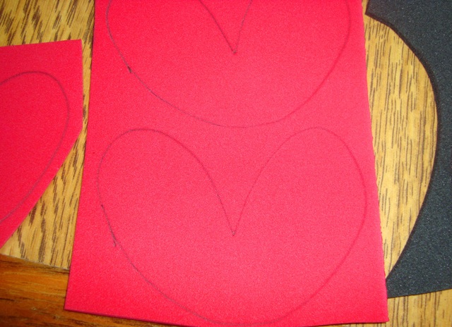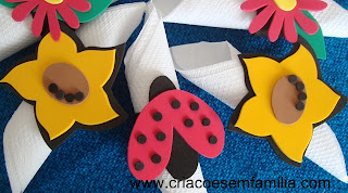 2) Risque sobre o EVA, recorte. Use um furador para fazer as bolinhas. Para cada joaninha você precisa de uma parte preta e duas vermelhas. Assim, ela fica igual, olhando de qualquer um dos lados!