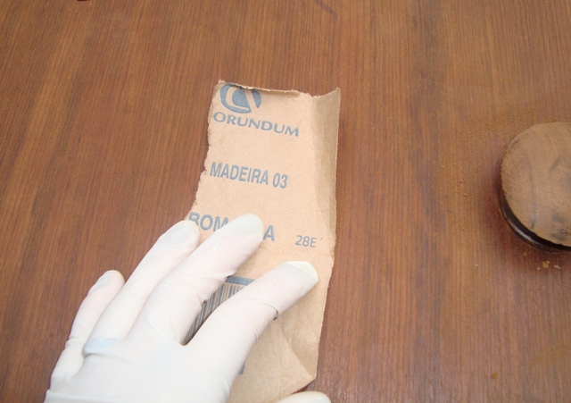 1 – Lixar a peça – usei lixa bem grossa para madeira (80), pois tinha que tirar lustra-móveis de 15 anos de uso