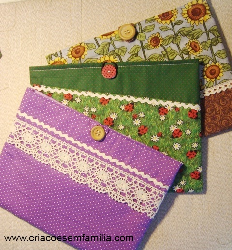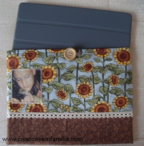 Adivinha qual é o meu? Além dos girassóis, proveitei uma foto impressa em tecido e personalizei um pouco mais! Vejam que dá pra colocar com a capa.