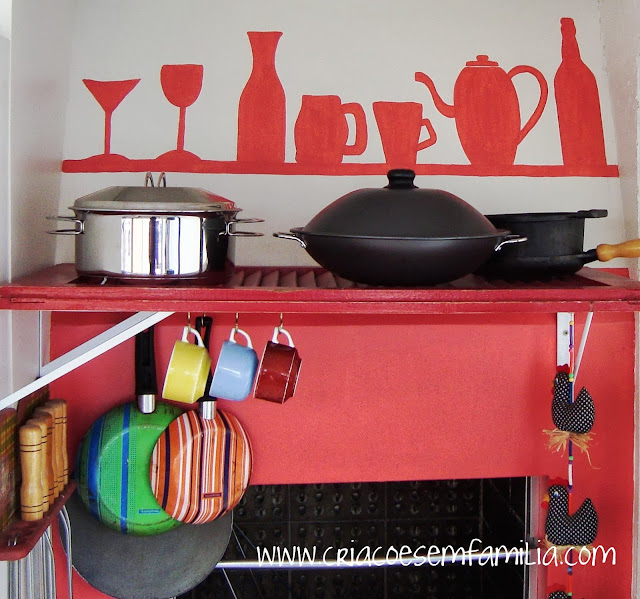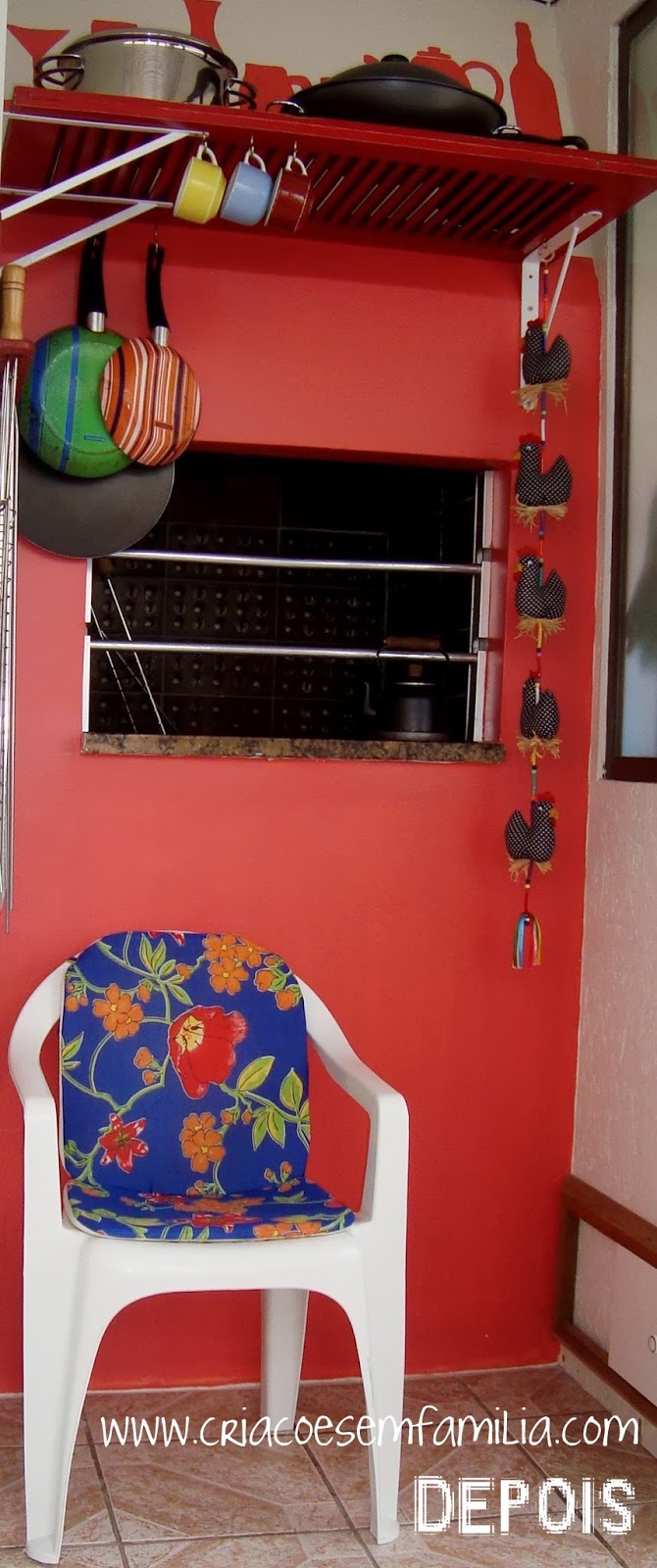 Ficou lindo! Uma pintura, uns detalhes criativos e transformou o cantinho, mostrando que não é preciso muito para dar um toque especial a casa. Caprichado, bem pensados os detalhes, adorei pintura das panelas acima da estante! Quanto à cor escolhida, sou suspeita para falar: gosto de vermelho, deixou mais vivo, alegre. Beijos