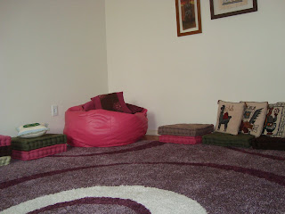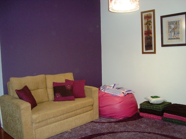 Que graça essa sala ! As cores casaram perfeitamente pois a parede berinjela e o puff rosa fizeram um belo composê e o sofá bege, por ser neutro, fica bem com qualquer cor viva e forte . Adorei os toques que vc deu na sala … Bjs e obrigada pela visita em minha sala !