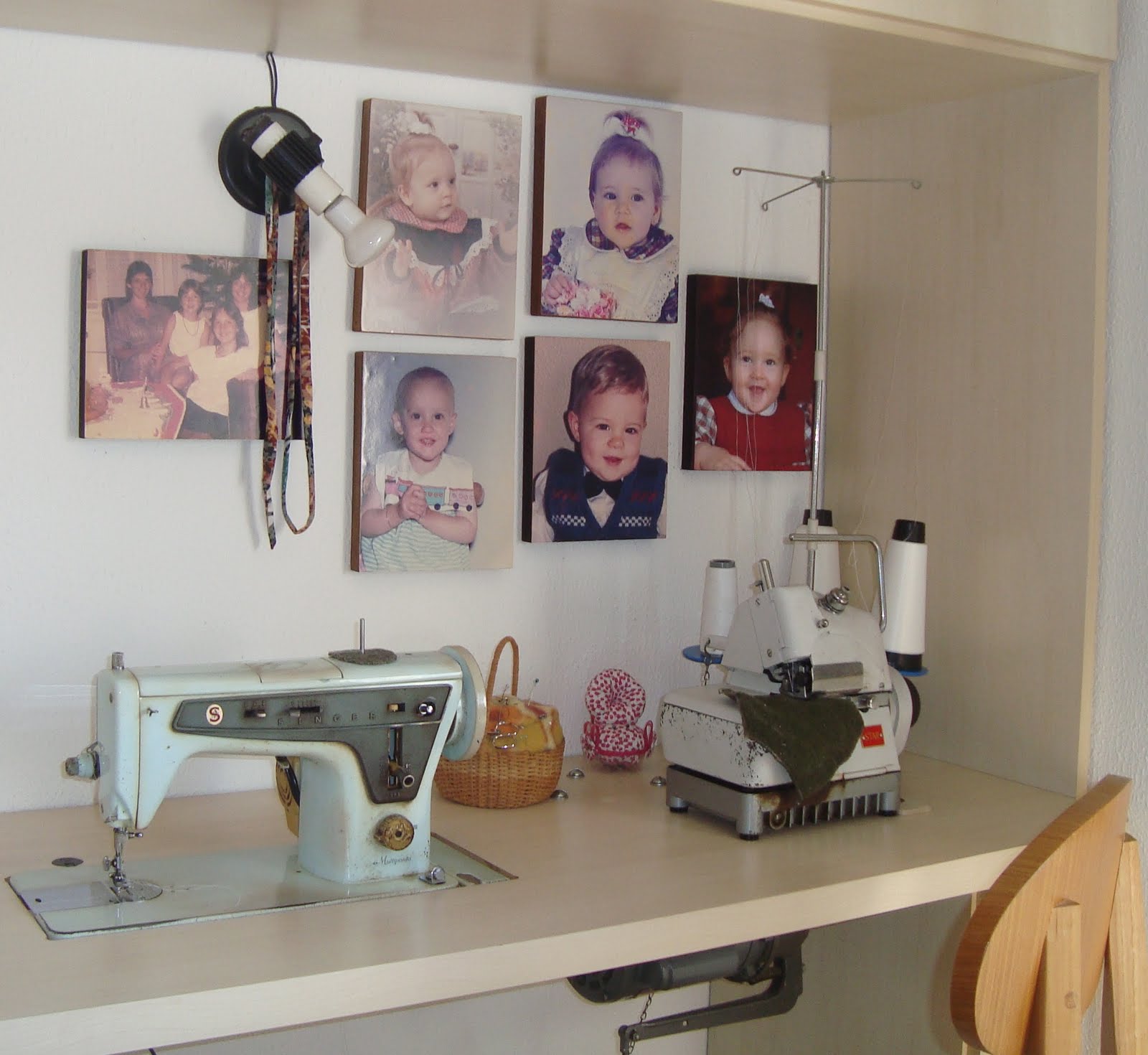 E, pasmem: ela continua usando a máquina… com costuras para a família. Hoje, no canto de costura dela, tem também uma overlock, com a qual costura malhas – e ali juntinho, as fotos das filhas, das 4 netas e do neto…e do neto que vem agora.