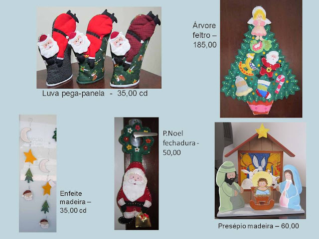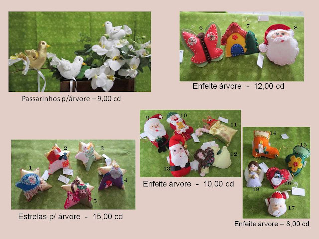 Vejam só algumas peças – tem feltro, MDF, tecido… pra se organizar, tem até os preços junto!