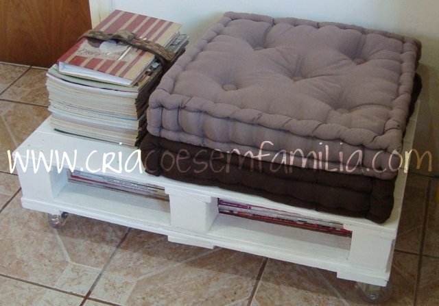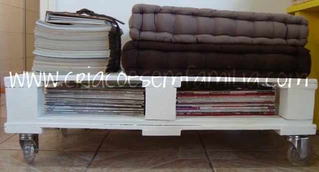 Como comentei em outro post, reaproveitei dois pallet (naquele post também menciono minhas inspirações, não deixe de ver!). Este segundo ficou menor, pois usei “atravessado” para fazer “dois andares” e poder guardar revistas.