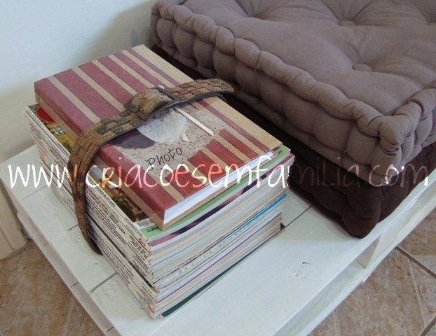 E para que as revistas sobre o banco não fiquem caindo, peguei um cinto que já não dava mais pra usar, ajustei o tamanho e prendi. Essa ideia já vi em muitos blogs, mas por último, bem enquanto eu estava montando o pallet, vi num post da Halorna, do blog Organização e Arte.
