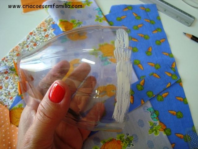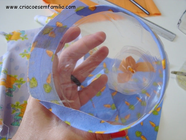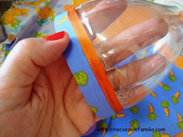 2 – Fechamento das pontas: o jeito mais fácil e rápido de fechar as pontas é com tecido. Fácil, fácil – do jeito que a gente fecha qualquer casquinha de ovo. Fica a ideia – e, claro, podem encher de fitinhas, laços, fuxicos, o que quiserem… É só cortar um círculo 1cm maior que o orifício, fazer pequenos picotes e colar! Veja na primeira foto.