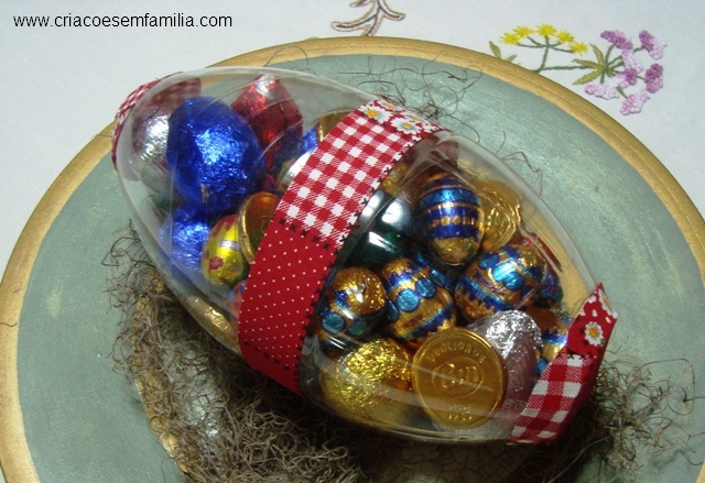 É só recear com guloseimas, chocolates ou mesmo qualquer outra surpresa, que pode estar, inclusive, embrulhada aí dentro. O ovo fica com aproximados 19 cm. Cabe bastante coisa!!!