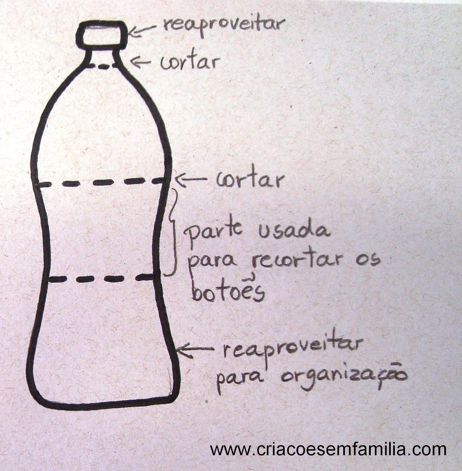 1 – São necessárias 2 garrafas. Testei com várias garrafas pet, mas as que mais se adequaram ao formato e facilitaram o acabamento, foi 1 de coca e uma de pepsi, de 2 litros (nem tomamos o refrigerante aqui em casa, então, tive que coletar por aí…!). Na figura abaixo, tem o