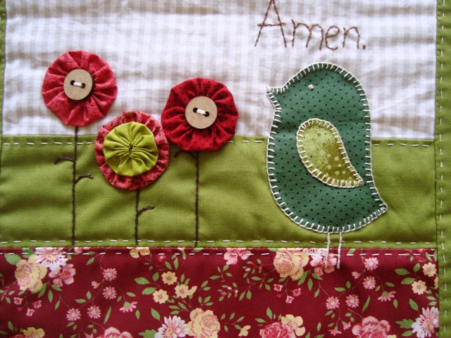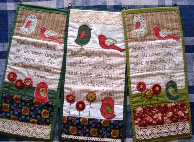 Aproveitei as férias e lentamente terminei esta encomenda. São 3 panôs, com uma oração de mesa (tradução aqui) – um para a querida colega que os encomendou, outro para sua irmã e um para sua mãe… por isto são parecidos, mas não iguais!