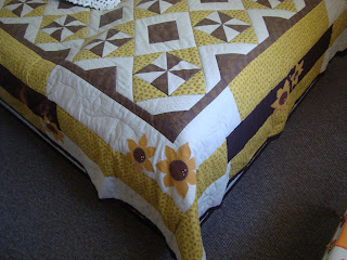 E o patchwork é trabalho da minha irmã Liliana. No detalhe, a aplicação de girassóis…