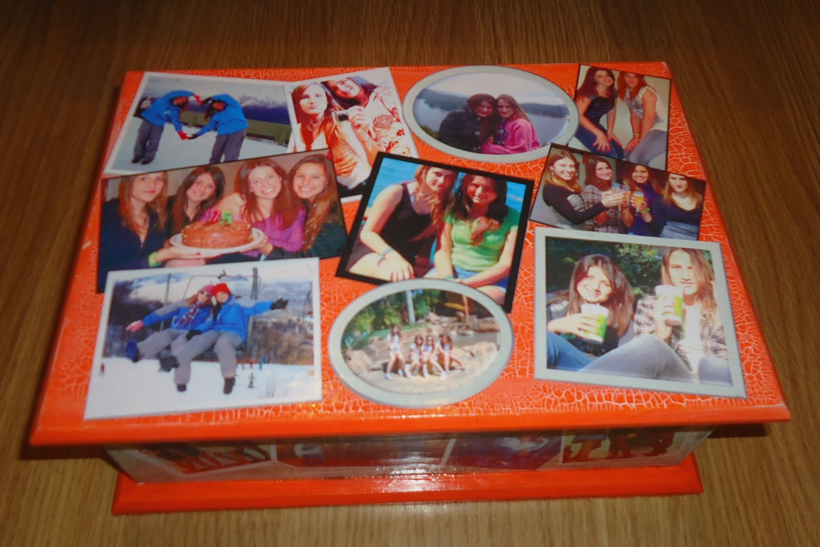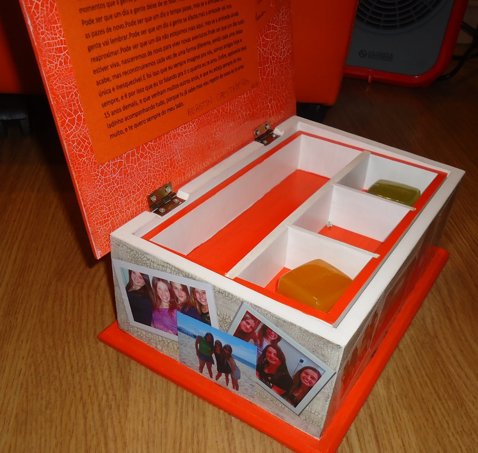 Minha filha queria dar um presente diferente para uma amiga, no aniversário de 15 anos. Selecionou as fotos e imprimimos em papel adesivo. A caixa, foi pintada e craquelada com as cores do quarto da amiga.