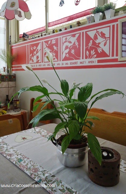 Dentro de casa, tem artesanato novo na decoração. São peças que comprei na loja da Associação Casa Catarina, num shopping, em Florianópolis. Também tem flores e pássaros, combinando com os cantinhos por aqui.