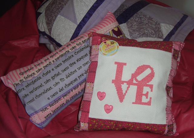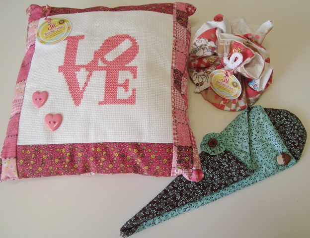 Da Ju, do blog Ju Arte na praia, ganhei esses mimos, feitos por ela… Lá no blog e na lojinha dela podem encomendar essas belezuras! Uma almofada, um porta biju pra levar pras viagens e um porta-tesouras. Já está tudo em uso!