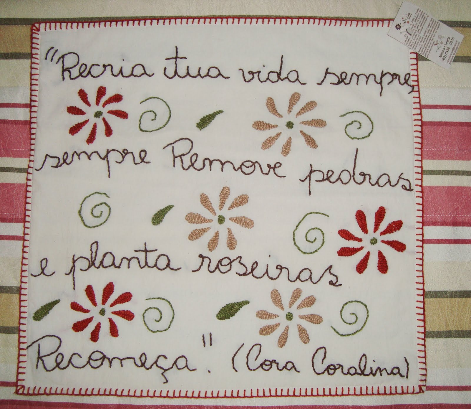 Na loja Cabocla Criações encontrei trabalhos do Projeto Cabocla – Bordando Cidadania, como esta capa de almofada, com bordados inspirados na obra de Cora Coralina. O projeto tem um blog – veja aqui!