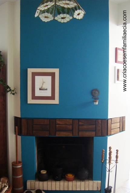 Decidi muito rapidamente o que faria, e foram 5 minutos entre ver, pedir os tacos e resolver o que fazer. Mas pensando depois, foi resultado de maturação. Entendo nada de processo de criação (os Bugs, sim!), mas achei interessante pensar nele. Então, resumindo (por que tem muito mais elementos constitutivos), foi assim: dentre as ideias para a lareira, como falei aqui, há tempo estava o uso de madeira de demolição; quando vi os tacos, pensei “tacos de demolição”, pensei pedir, pensei colar no detalhe da parede da lareira; aí lembrei que branquinha não tinha graça… olhei pra minhas unhas que estavam com turquesa Hippie Chic, que comprei por ter ganhado o Azul Sapatilha da Fátima e aí a Fernanda Reali comentou que gostava era do Impala Hippie Rua, mas eu só achei o Hippie Chic (Colorama)… e aí lembrei de vários posts da Eva, com turquesa na decoração, que achava lindo e pensava que não ia achar jeito de usar aqui… mas aí lembrei que na parede da mesa de comer, logo ali, tem uma cor coral – será que não ia ficar tudo muito esquisito? mas não dava tempo de falar com o compadre e guru das cores, o Maurílio do Bugstudium, mas lembrei das lições de que azul e laranja se complementam – e concluí que turqueza e coral, também devem ser complementares (se não são, já não adianta mais!). E pronto, era só executar!!!!
