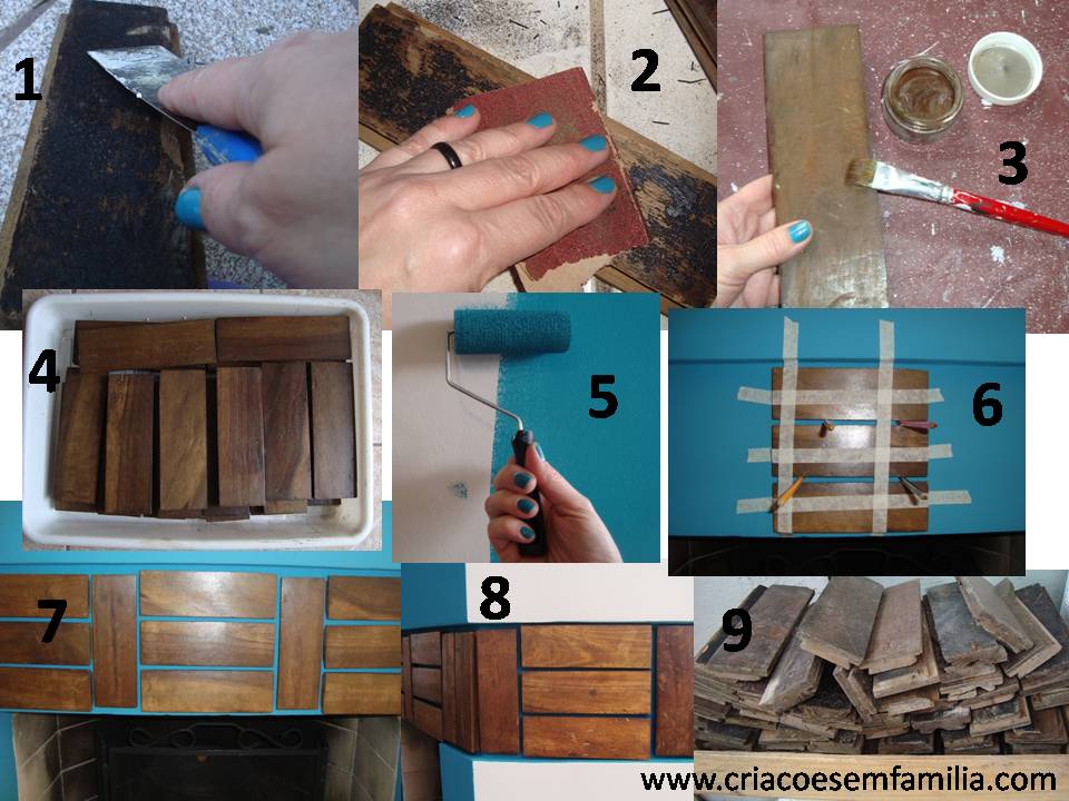 1- descascar o piche e lavar / escovar; 2 – lixar para deixar a superfície lisa; 3 – cera pátina cor chocolate; 4 – precisei 23 peças; 5 – pintar a parede (duas mãos); 6 – colar os tacos e dar suporte até a cola secar; 7 e 8 – montagem pronta; 9 – mais uns 40 tacos para outro trabalho…!