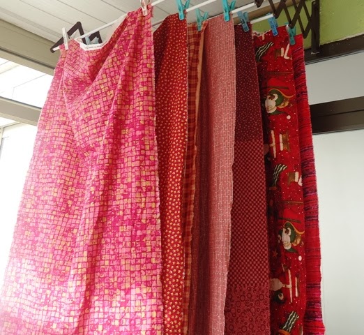 Há duas semanas uma loja fechou, e os últimos tecidos estavam em promoção. Aproveitei o bom preço para comprar estampas diferentes, que eu não tinha. A parte chata, mas necessária, é a lavagem dos tecidos antes de usá-los: evita o encolhimento após costura da peça, tira a goma e indica tecido que possam manchar. Ontem aproveitei o dia quente e seco para fazer isto. Aí está o varal dos vermelhos.