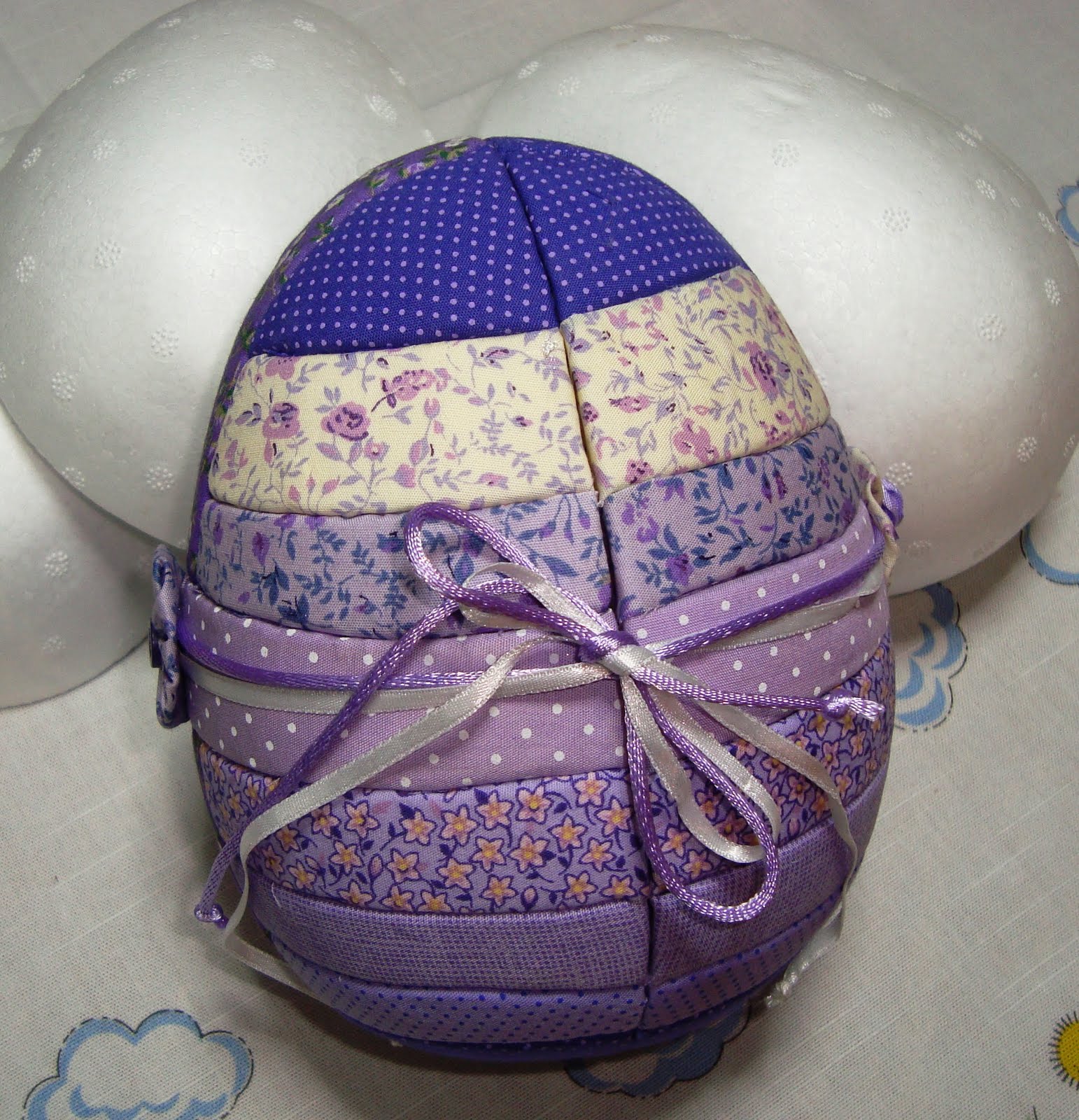 Ah, para fechar, como podem ver, usei fitas. Nos pontos em que as colei (com cola quente), usei fuxicos.